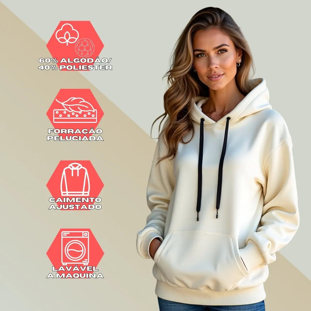 Modelo Canguru Clássico: Possui bolso frontal amplo para maior praticidade e estilo, além de capuz ajustável com cordão para proteção contra o vento.